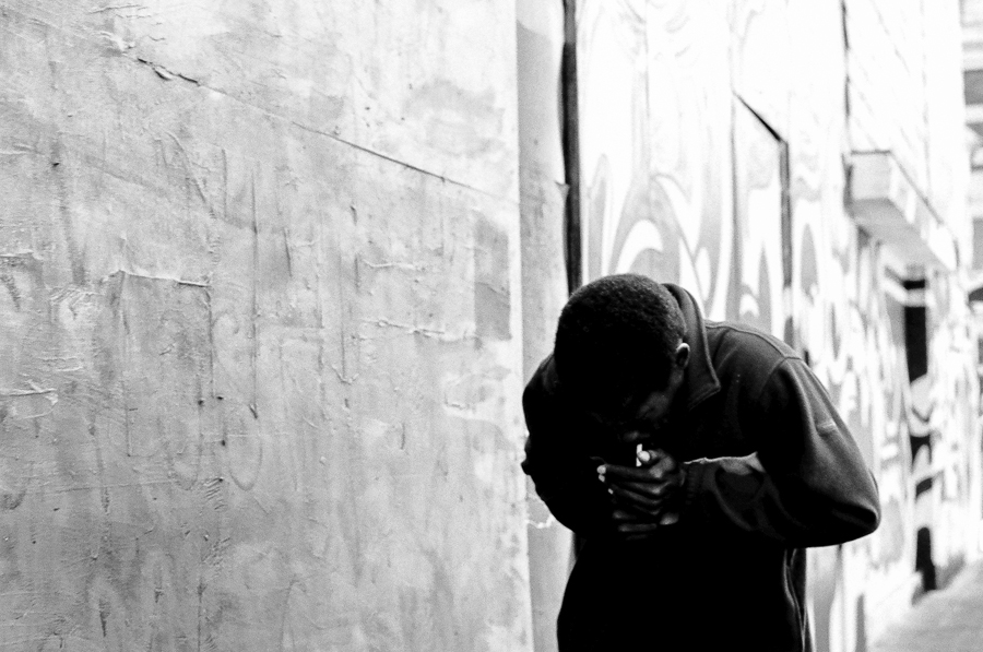 This man was enveloped in the smoke from his cigarette. There are a lot of people like this on Mission Street.