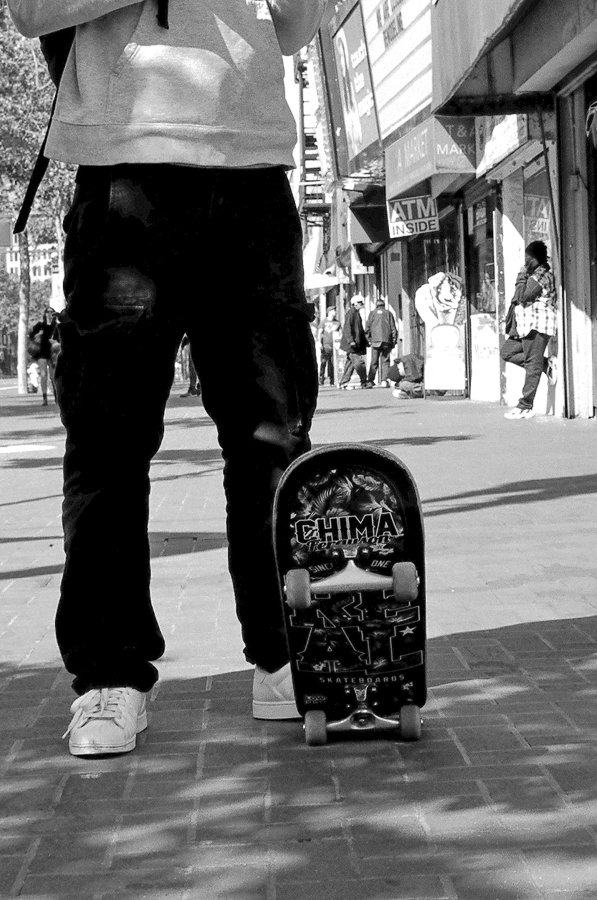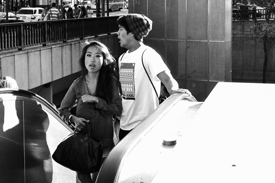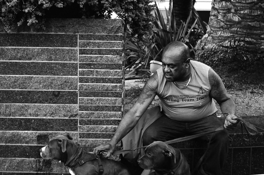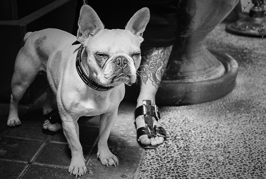 This is one of my favourite street photos so far. It was taken at Santana Row, San Jose. I thought that the girl’s tattoo and the dog were an interesting combination so I asked if I could get a picture of the dog. I took the photo without looking through the viewfinder, focusing by distance.