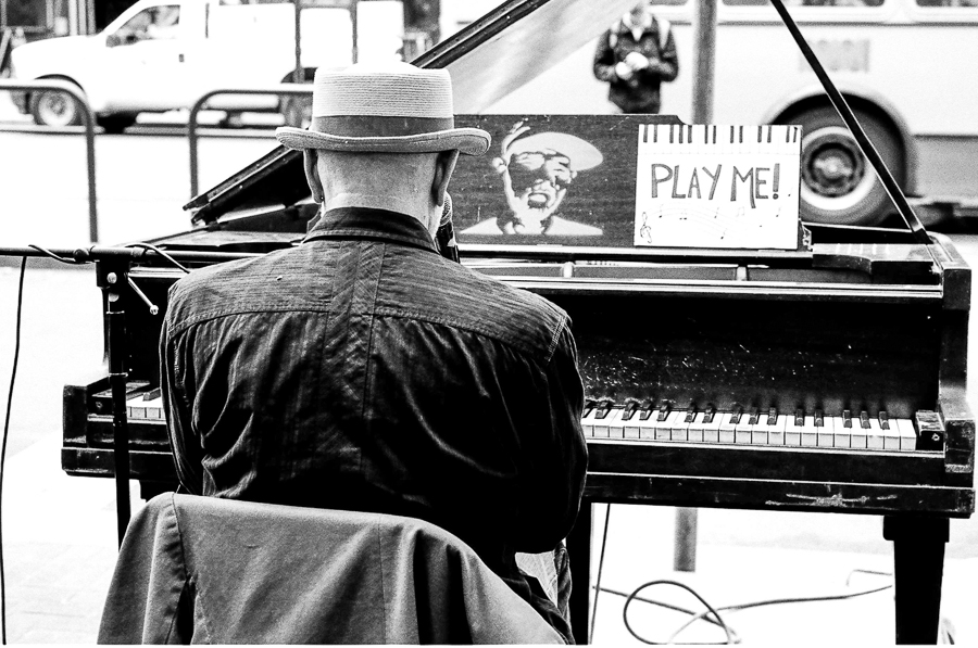 Although, purists say that taking photos of performers isn’t street photography, I like the reflections of the metal, and it’s not every day you see someone playing two instruments at once.