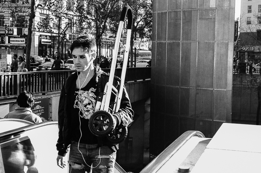 A lot of street photos show surprised faces, so this is mine. He was skateboarding down Market Street and spotted my camera at the last second.