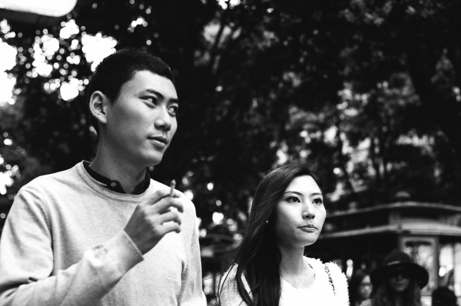 One of the timeless qualities of this camera and film combination is that the focus degrades nicely with distance. In this photo, the focus and center of attention is on the woman with her strained expression, but the man’s softer expression with him mellowing out with his cigarette is matched with the softer focus. This provides a nice contrast.