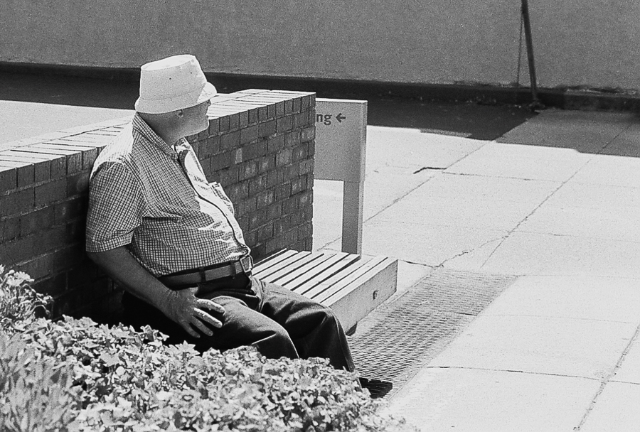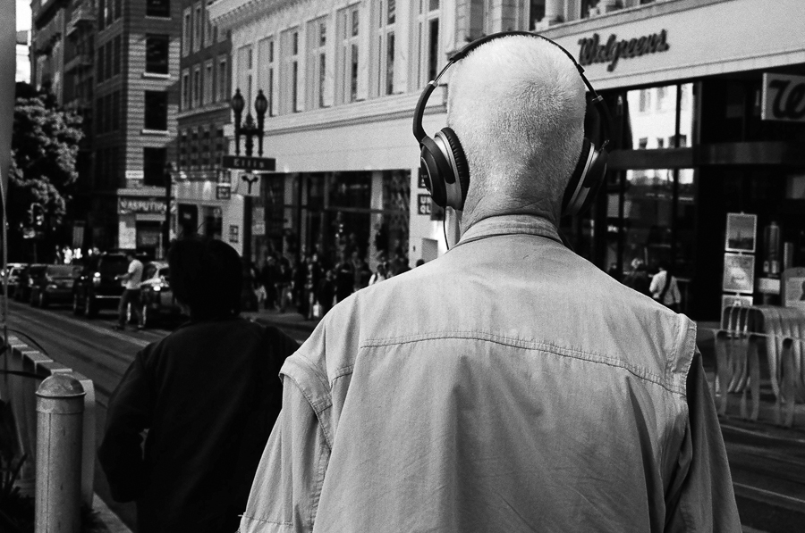This man was picked out from the background by a shaft of light and I thought it unusual for an older man to we walking around with large headphones. I’m also curious about the shape of his shoulders. Is he hiding something under his jacket, or does he have scoliosis?
