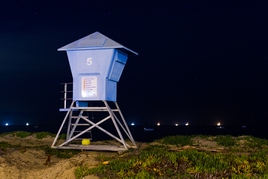 This is an old lifeguard station. Out in the ocean you can see the lights of oil rigs that are located in this particular part of the bay.