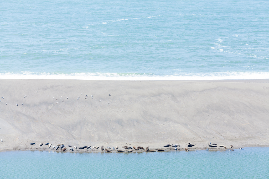 This is a rookery of harbor seals, enjoying the sunshine on the bank of a river just before it flows into the ocean.
