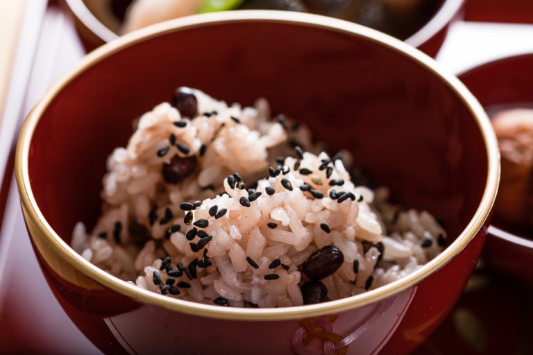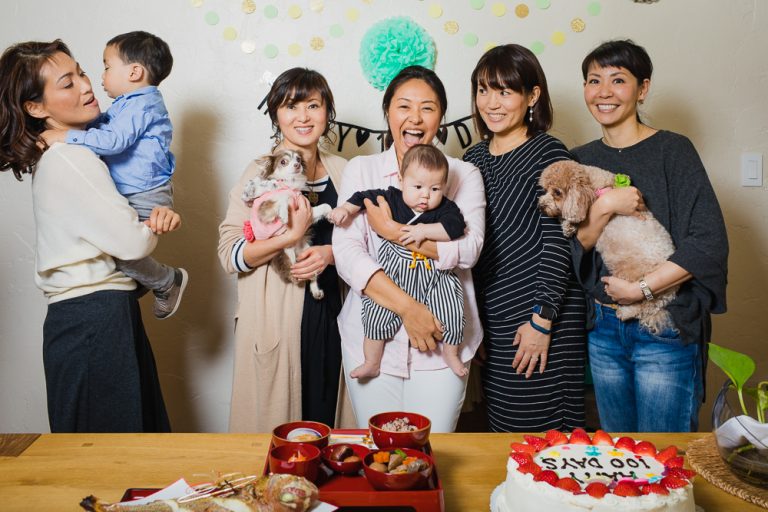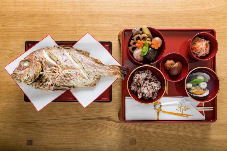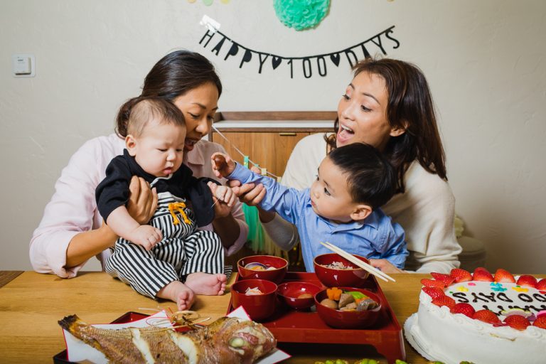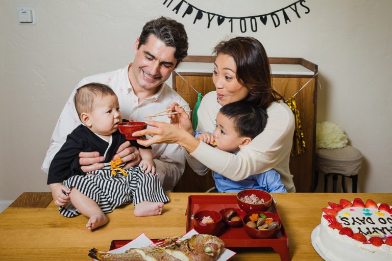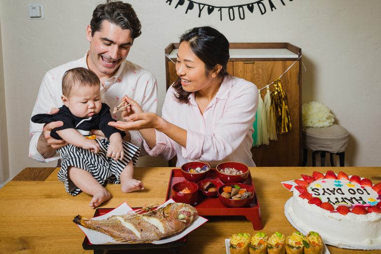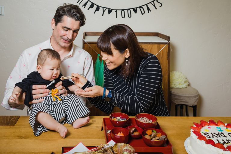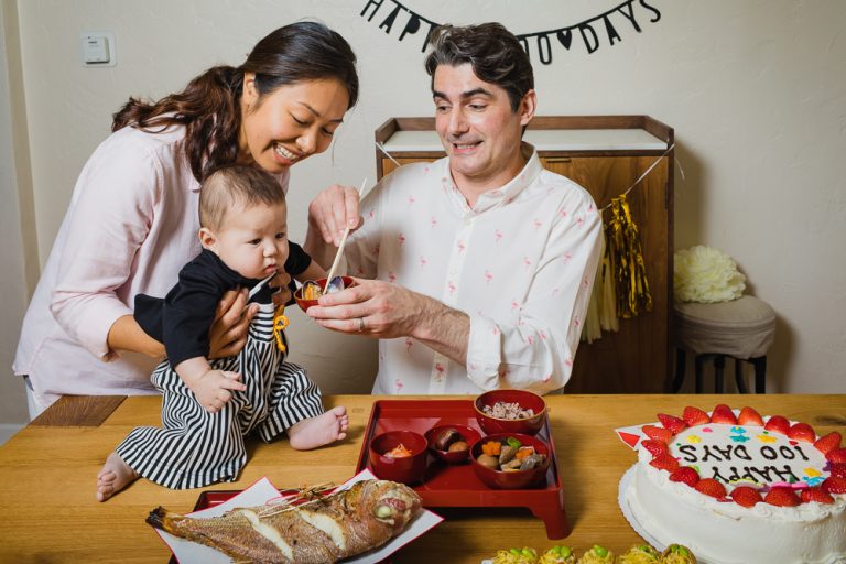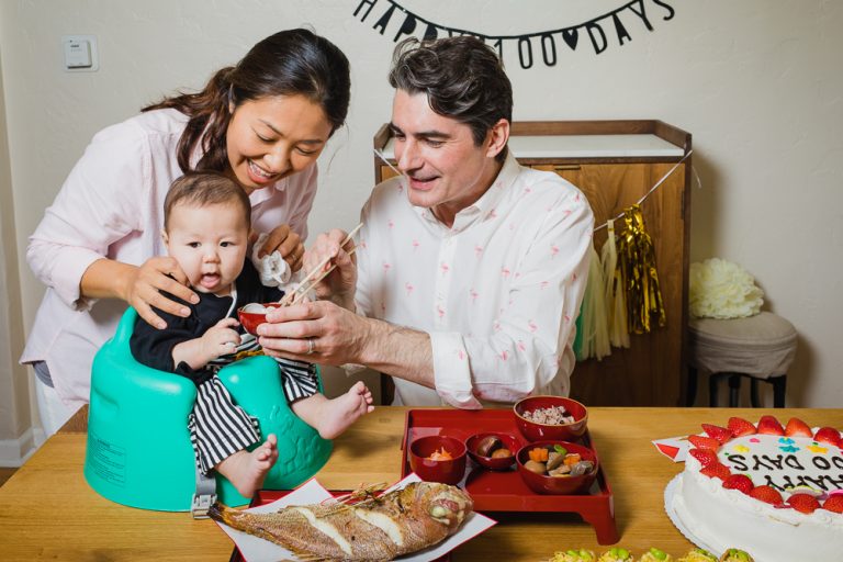 Okuizome is an ancient Japanese ritual that celebrates 100 days of life and brings luck for the future. The celebration is centered around particular foods served on lacquer dishes with tall feet. Friends and family pretend to give the infant foods in a certain order. The meal consists of a whole fish, soup, steamed rice with adzuki beans, and three side dishes. The side dishes traditionally include a plum, a pickled dish, and a simmered dish. The meal also includes a hard ‘stone’ to ensure good teeth. We used a chestnut in place of a stone.