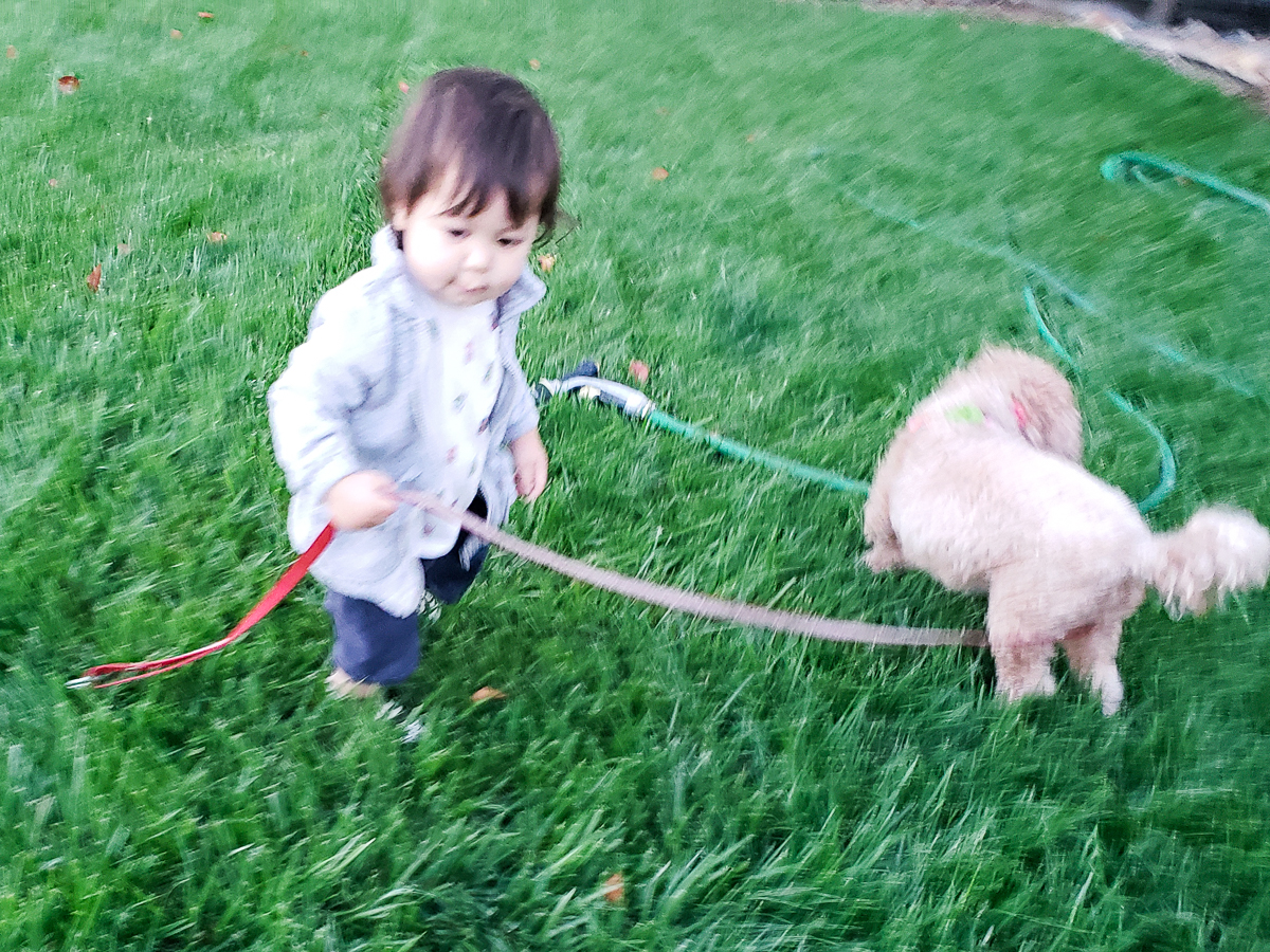 After some dinner, we walked the dog around the block. And just to prove that cell phone photos are no match for a real camera, here’s my best photo of Louie playing with the dog on the front lawn.
