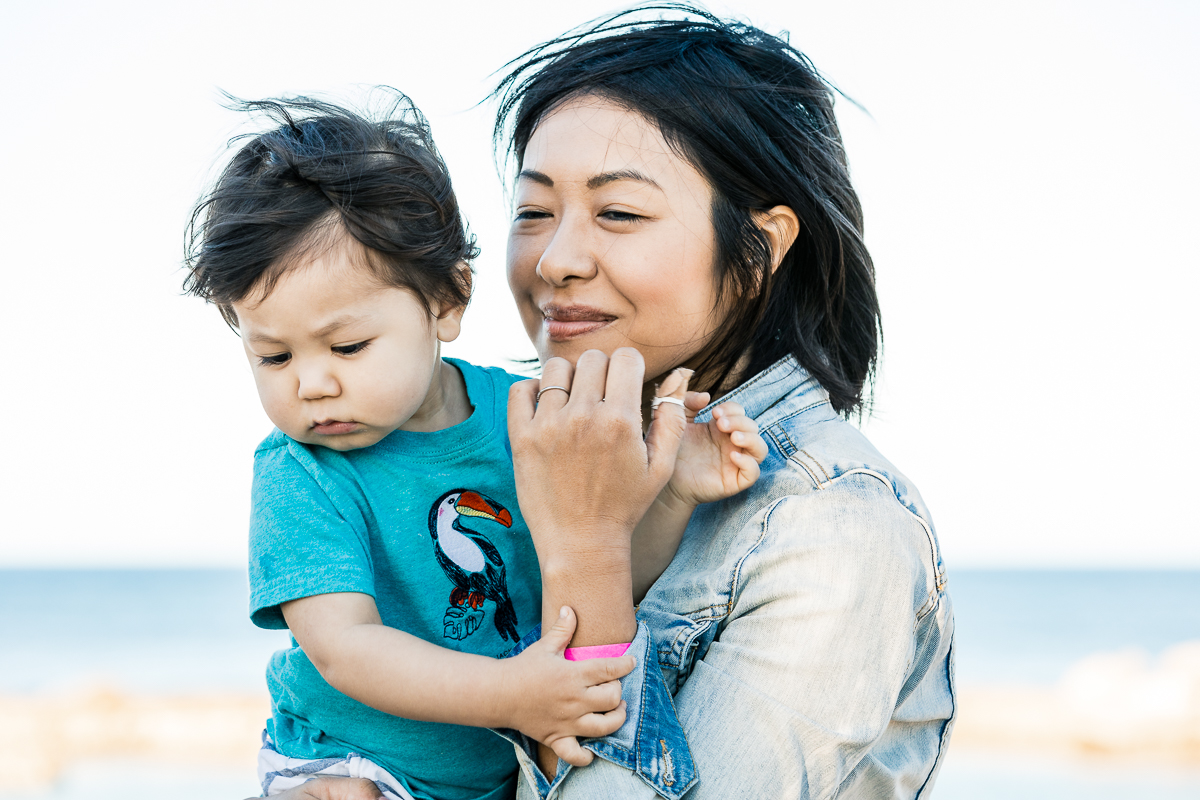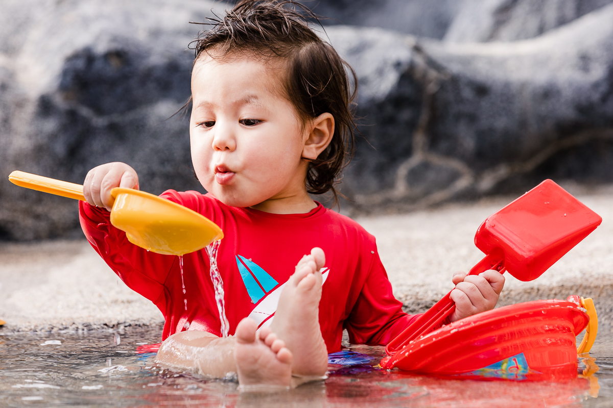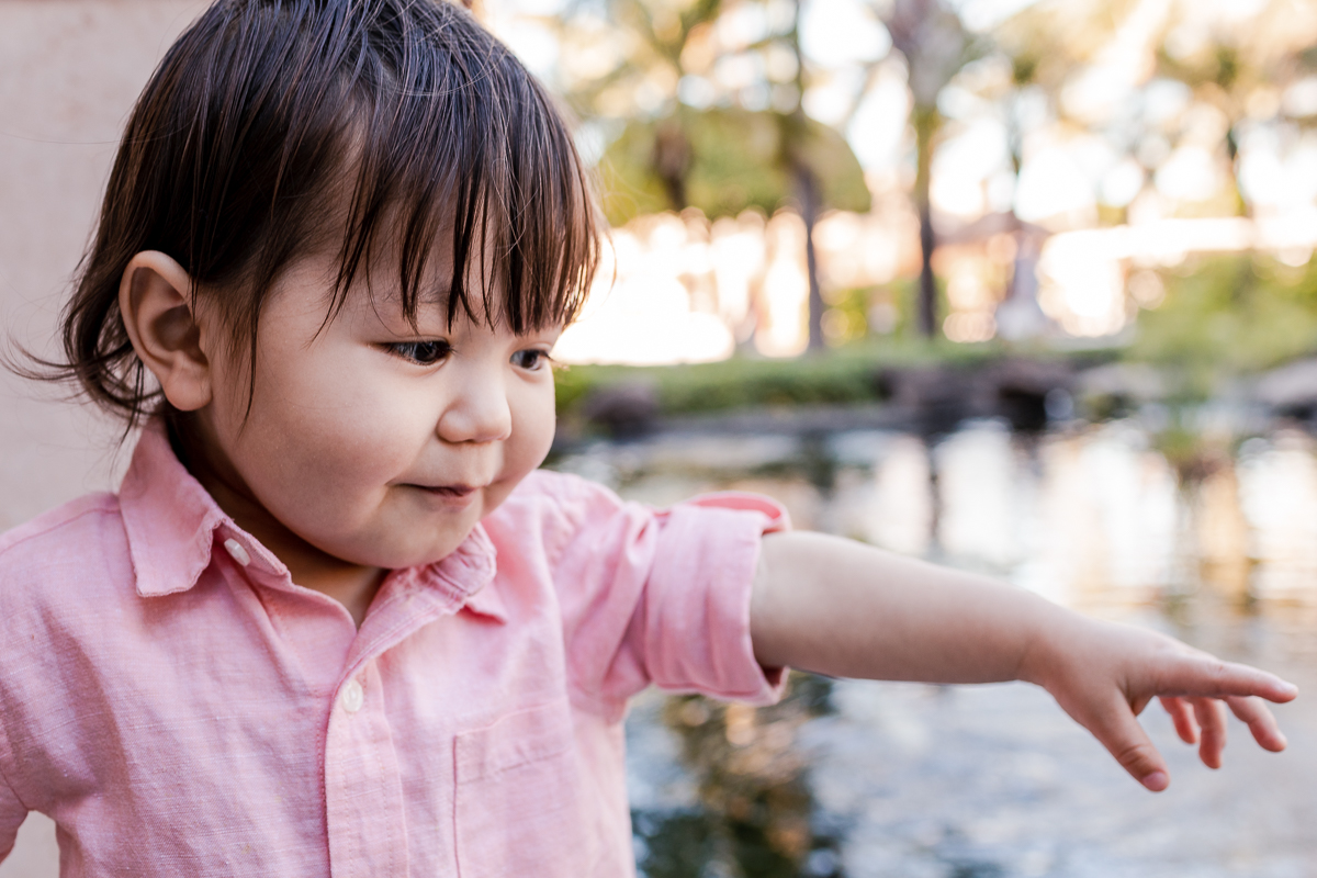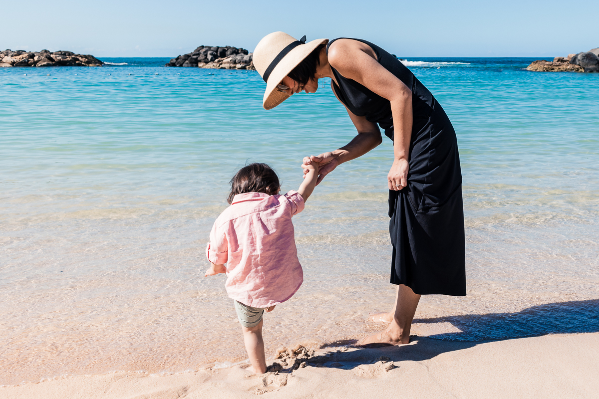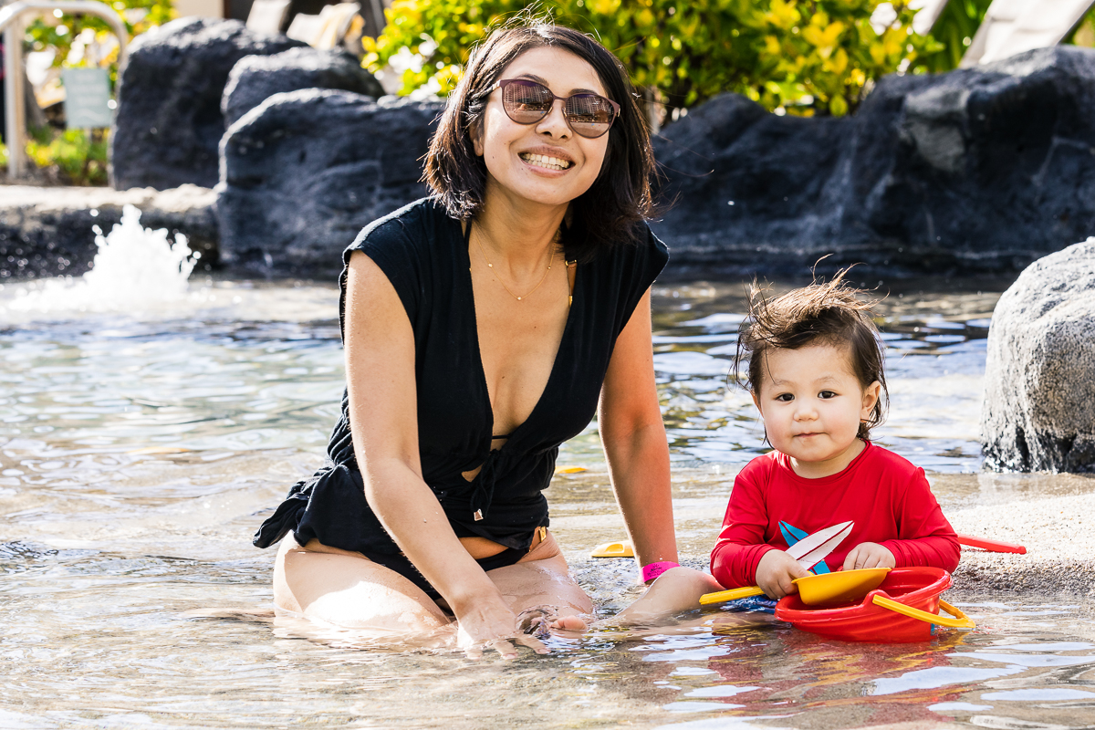 I did take him out into the lagoon, but the water was cool and salty and he wasn’t comfortable there. He wanted to be back on land with Mama and was more at home in the hotel paddling area.