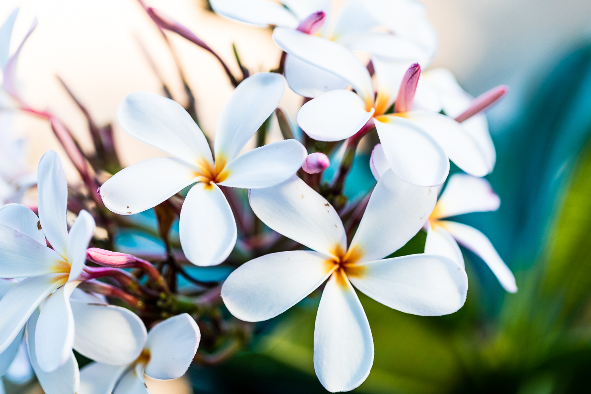 Hawaii has an interesting flora. I especially like the trees with clean trunks and broad fluffy canopies called both rain trees or monkeypod trees. Of course, there were lots of plumeria flowers on the grounds like these white ones.